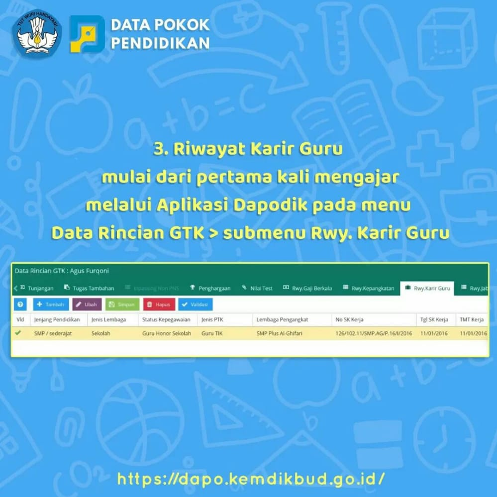 Riwayat karir guru mulai dari pertama kali mengajar melalui Aplikasi Dapodik;